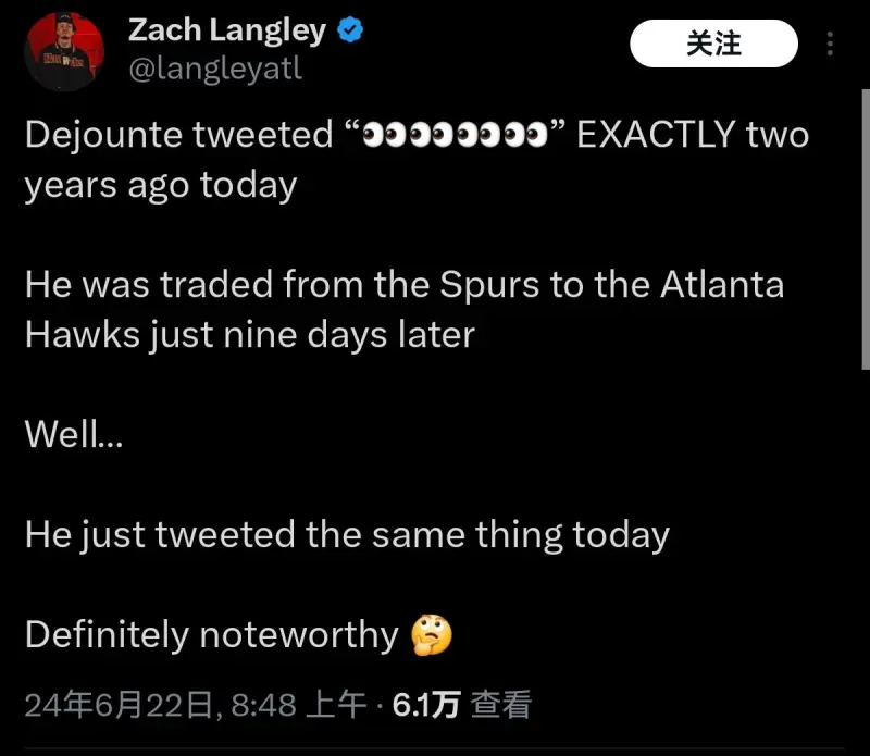 默里在推特上发了一个眼睛表情符号 后来又删除了 两年前他在推特上也发过同样的事情 然后被交易到老鹰队 admin 2024-06-22 208 6月22日讯今天,老鹰后卫德章泰·穆雷发推文:“”,随后自己删除了这条推文。 值得一提的是,两年前的今天,穆雷曾在推特上发布过同样的内容,并在九天后被马刺队交易到老鹰队。 The End 标签:老鹰年前