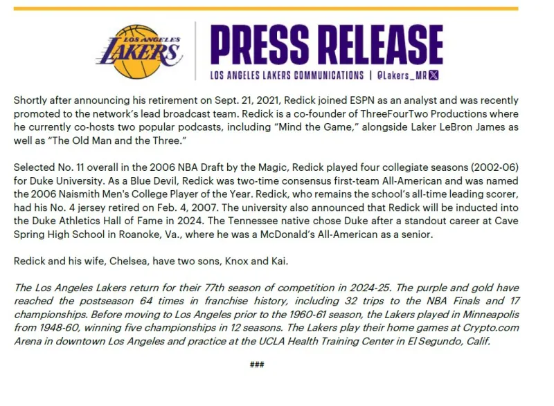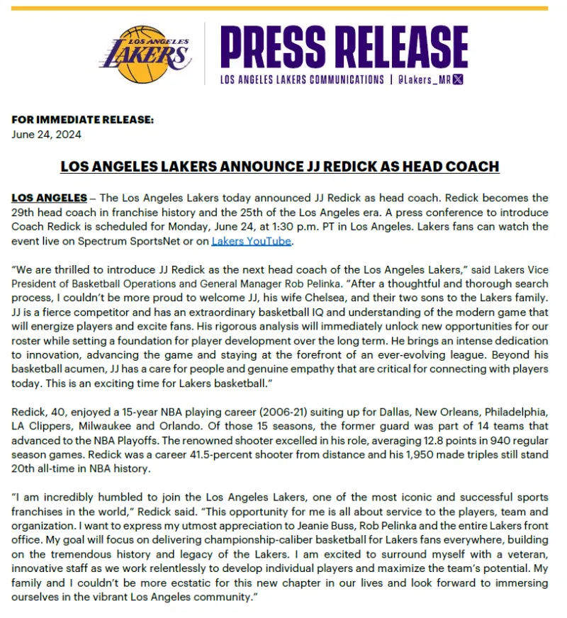 6月25日,洛杉矶湖人队正式宣布聘请JJ雷迪克担任主教练。