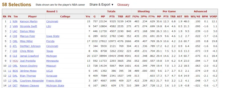 2000年的前五名新秀是肯扬·马丁、斯威夫特、达柳斯·迈尔斯、马库斯·菲泽和迈克·米勒。该届职业生涯成就最高的新秀是贾马尔。 -克劳福德,被认为是历史上最糟糕的选秀年份之一。